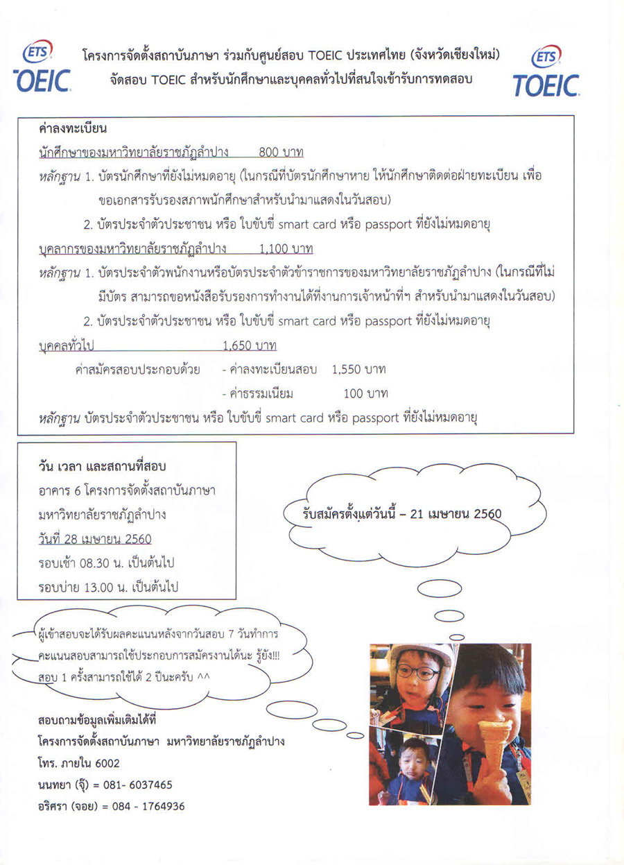 โครงการจัดตั้งสถาบันภาษา ร่วมกับศูนย์สอบ TOEIC จังหวัดเชียงใหม่ จัดสอบ TOEIC สำหรับนักศึกษา บุคลากรภายใน และบุคคลภายนอกที่สนใจ ณ สำนักงานโครงการจัดตั้งสถาบันภาษา อาคาร 6 ชั้น 1 ในวันศุกร์ที่ 28 เมษายน 2560 ผู้ที่สนใจเข้ารับการสอบสามารถแจ้งชื่อได้ที่โครงการจัดตั้งสถาบันภาษาตั้งแต่วันนี้ – 21 เมษายน 2560