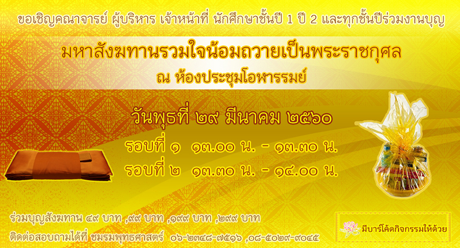 ชมรมพุทธศาสตร์ มร.ลป.ขอเชิญคณาจารย์ ผู้บริหาร เจ้าหน้าที่ นักศึกษาชั้นปีที่ 1 ปี 2 และทุกชั้นปีร่วมงานบุญ “มหาสังฆทานรวมใจน้อมถวายเป็นพระราชกุศล” เดือนมีนาคม60 by ผู้ดูแลระบบ - มีนาคม 21, 20170 เปิดอ่านแล้ว : 682 แสดงความคิดเห็น commentsGD Star Ratingloading...ชมรมพุทธศาสตร์ มร.ลป.ขอเชิญคณาจารย์ ผู้บริหาร เจ้าหน้าที่ นักศึกษาชั้นปีที่ 1 ปี 2 และทุกชั้นปีร่วมงานบุญ "มหาสังฆทานรวมใจน้อมถวายเป็นพระราชกุศล", 10.0 out of 10 based on 1 rating Share on FacebookShare on TwitterShare on Linkedin Facebook iconFacebookLINE iconLine
