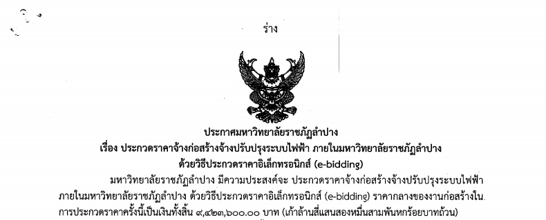 (ร่าง)ประกวดราคาจ้างก่อสร้างปรับปรุงระบบไฟฟ้า ภายในมหาวิทยาลัยราชภัฏลำปาง (e-bidding),