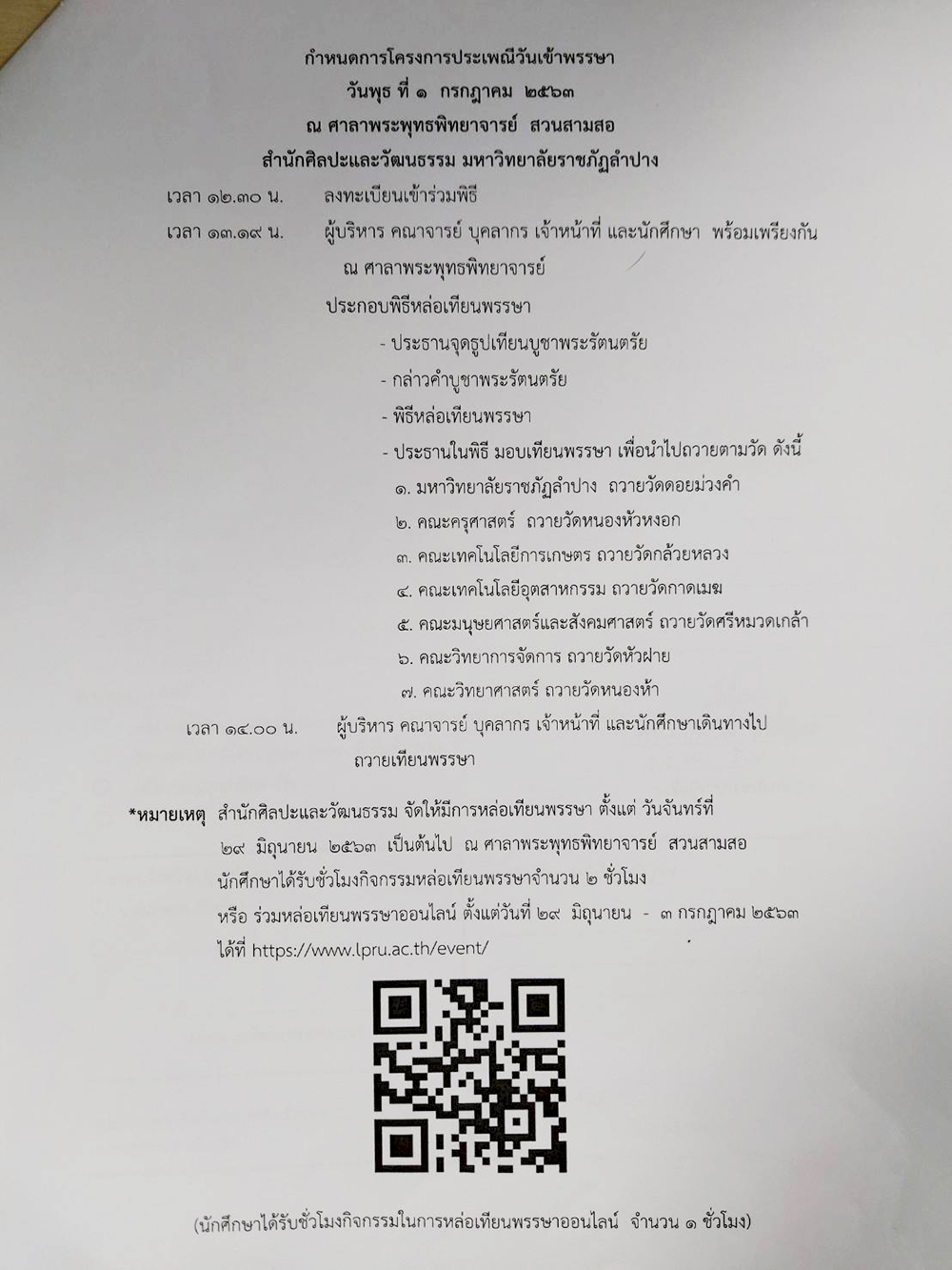 สำนักศิลปะและวัฒนธรรม มร.ลป ขอเชิญชวนบุคลากร นักศึกษา มร.ลป เข้าร่วมโครงการประเพณีวันเข้าพรรษา หล่อเทียนพรรษาออนไลน์,