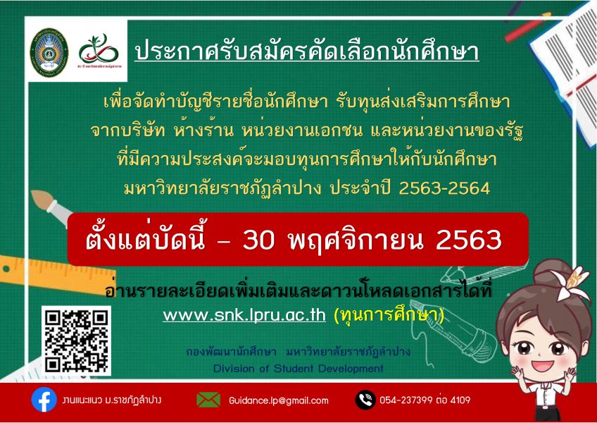 ด้วย กองพัฒนานักศึกษา มหาวิทยาลัยราชภัฏลำปาง กำหนดรับสมัครคัดเลือกนักศึกษา เพื่อจัดทำบัญชีรายชื่อนักศึกษา เพื่อรับทุนส่งเสริมการศึกษา จากบริษัท ห้างร้าน หน่วยงานเอกชน และหน่วยงานของรัฐ ที่มีความประสงค์จะมอบทุนการศึกษาให้กับนักศึกษา มหาวิทยาลัยราชภัฏลำปาง ประจำปี 2563-2564