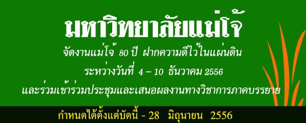 มหาวิทยาลัยแม่โจ้ ได้จัดงานแม่โจ้ 80 ปี ฝากความดีไว้ในแผ่นดิน ระหว่างวันที่ 4 – 10 ธันวาคม 2556 จึงขอเชิญคณาจารย์ นักวิจัย นักวิชาการ นิสิต นักศึกษาระดับบัณฑิตศึกษา และผู้ที่สนใจเข้าร่วมประชุมและเสนอผลงานทางวิชาการภาคบรรยาย และภาคโปรสเตอร์ในสาขาวิชาต่าง ๆ ได้แก่เกษตรศาสตร์ วิทยาศาสตร์และเทคโนโลยี วิศวกรรมและอุตสาหกรรมการเกษตร และสังคมศาสตร์ โดยผู้สนใจสามารถกรอกรายละเอียดในแบบแสดงความจำนงเข้าร่วมการเสนอผลงานและจัดส่งต้นฉบับผลงาน บทคัดย่อ เรื่องเต็ม ตามรูปแบบที่กำหนดได้ตั้งแต่บัดนี้ – 28 มิถุนายน 2556