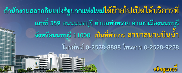 สำนักงานสลากกินแบ่งรัฐบาล แจ้งย้ายที่ทำการสลากกินแบ่งรัฐบาล ถนนราชดำเนินกลาง แขวงตลาดยอด เขตพระนคร กรุงเทพมหานคร ไปทำการ ณ สำนักงานสลากกินแบ่งรัฐบาล (สนามบินน้ำ) เลขที่ 359 ถนนนทบุรี ตำบลท่าทราย อำเภอเมืองนนทบุรี จังหวัดนนทบุรี 11000 โดยเริ่มปฏิบัติงานตั้งแต่ 1 ตุลาคม 2556 เป็นต้นไป สามารถติดต่อประสานงานหรือจัดส่งเอกสารตามที่อยู่ที่กล่าวไว้ข้างต้น