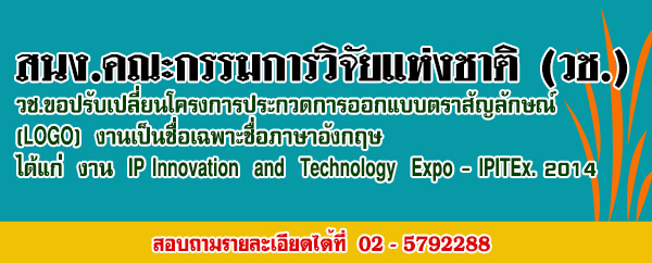 วช.ขอปรับเปลี่ยนโครงการประกวดการออกแบบตราสัญลักษณ์ (LOGO) งานเป็นชื่อเฉพาะชื่อภาษาอังกฤษ ได้แก่ งาน IP Innovation and Technology Expo – IPITEx. 2014 โดยผู้สนใจสามารถส่งผลงานเข้าประกวด