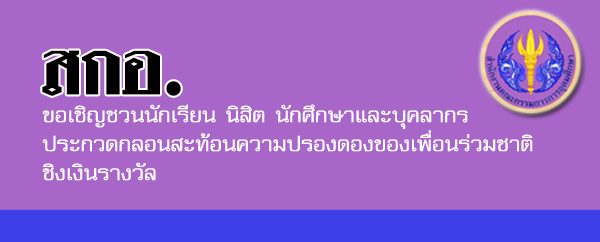 สำนักงานคณะกรรมการการอุดมศึกษาขอเชิญชวน นักเรียน นิสิต นักศึกษาและบุคลากรในสังกัดต่างๆเข้าร่วมกิจกรรม”ประกวดกลอนสะท้อนความปรองดองของเพื่อนร่วมชาติ”และประกวดขับรองเพลงหมู่สะท้อนความปรองดองของเพื่อนร่วมชาติ